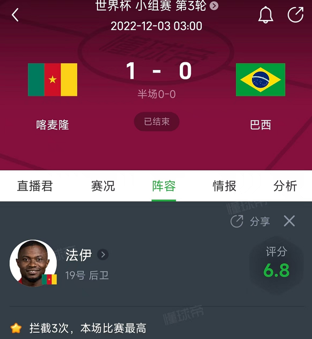 不过,法伊这次来了,作为喀麦隆国家队的主力国脚右后卫,在上届世界杯小组赛上,喀麦隆1比0击败巴西,法伊作为首发踢满全场,3次拦截是全场最高,众多巴西球星在喀麦隆强大的防线面前,最终无法破门,被零封落败,这也成为喀麦隆足坛的经典之战,这也足以展现法伊的实力和价值。